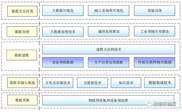 工业大数据技术架构共有五个部分,分别为数据采集层、数据存储与集成层、数据建模层、数据处理层、数据交互应用层。