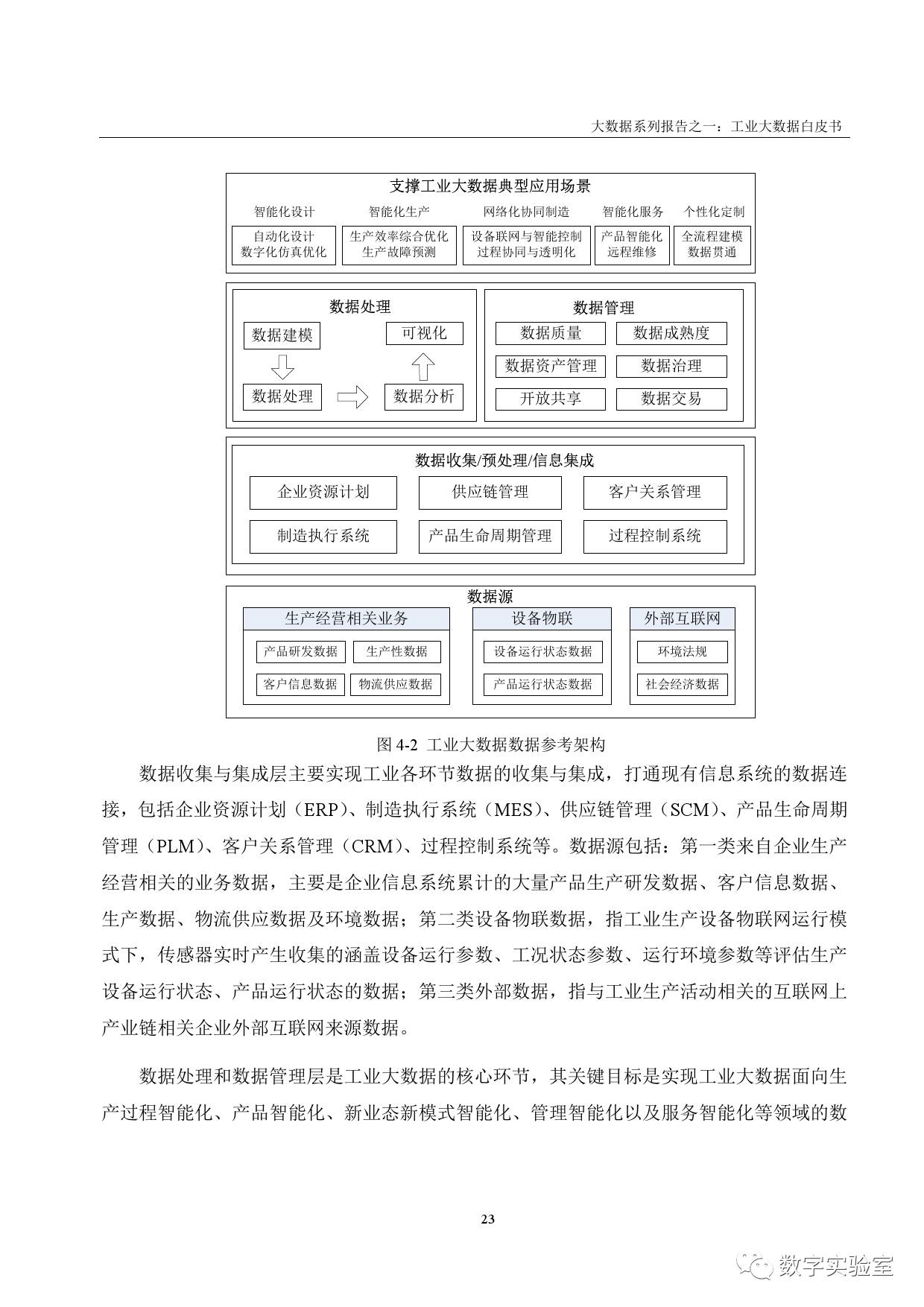 工业大数据参考框架,包括应用范围、典型运营模式、数据架构、技术架构和平台参考等。