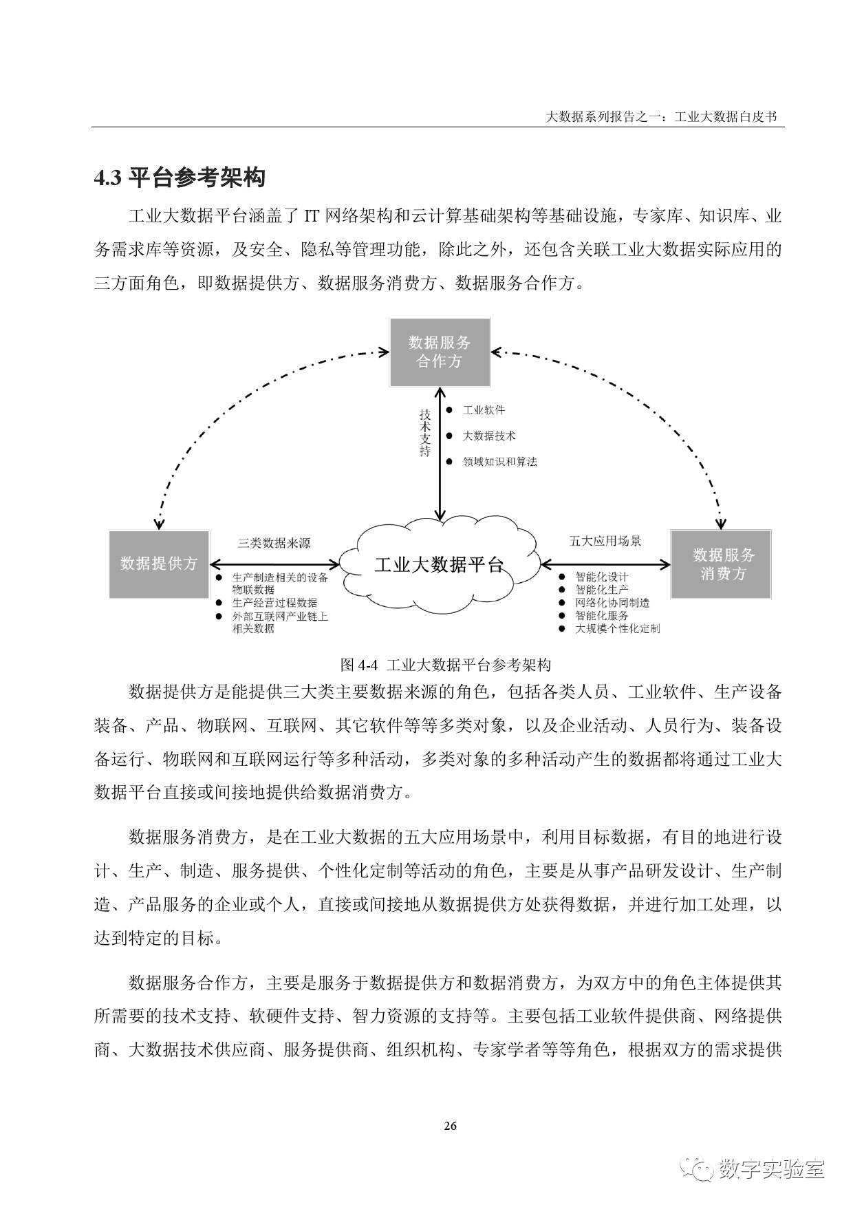 工业大数据平台涵盖了IT网络架构和云计算基础架构等基础设施,专家库、知识库、业务需求库等资源,及安全、隐私等管理功能。此外,还包含关联工业大数据实际应用的三方面角色,即数据提供方、数据服务消费方、数据服务合作方。
