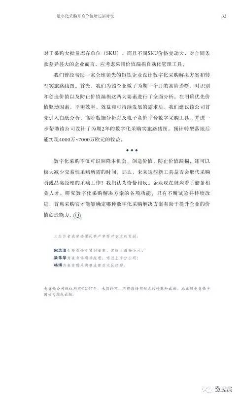 数字化采购不仅可识别降本机会、创造价值,防止价值漏损,还可以极大减少交易性采购所需的时间。那么,未来这些新工具是否会取代采购员或品类经理的采购工作?我们认为恰恰相反。企业现在就应着手储备相关人才,研究数字化采购解决方案的各项功能。只有不断试验并持续改进,首席采购官才能够确定哪种数字化采购解决方案有助于提升企业的价值创造能力。