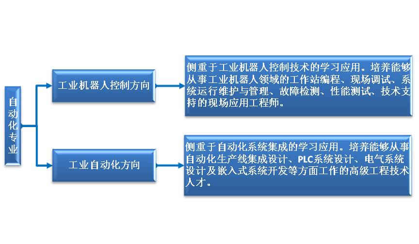 自动化专业作为校内机器人专业集群核心专业,实施“中德双元制”人才培养模式,校企协同培养,专业课实行小班化教学(30人/班),重点培养能够在工业自动化,特别是工业机器人技术相关领域从事软件设计、运行维护与管理、故障检测、系统集成等方面工作的高级人才。学生在校期间可参加德国职业资格考试,考核合格者可获得德国职业资格认证证书并推荐德资企业就业。发展前景为自动化相关领域技术负责人、项目负责人以及管理负责人等。