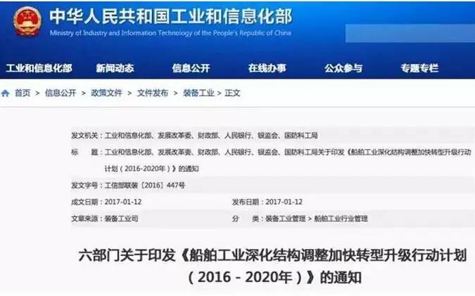 日前,由工信部、国家发改委、财政部、中国人民银行、银监会和国防科工局联合编制的《船舶工业深化结构调整加快转型升级行动计划2016-2020年》(以下简称“行动计划”)正式印发。