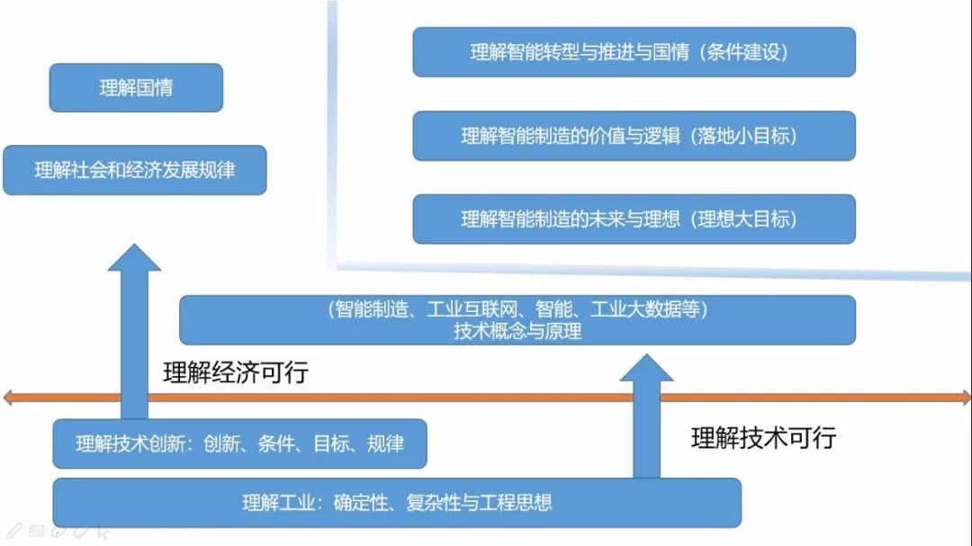 如果把智能制造理解为创新,就要理解技术可行性和经济可行性。其中,讲技术可行的时候就要(用前面创新的观念)讲到相关的技术概念和保证技术可行的办法。而讲到经济可行的时候,既要讲到社会经济发展规律、又要讲到中国的国情——规律告诉我们应该做什么、未来是怎样的,而国情约束我们应该怎么做才能有经济性。