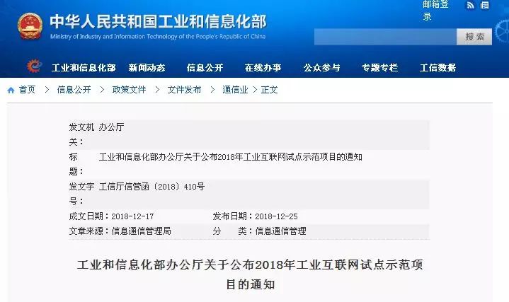 12月25日,工信部发布《工业和信息化部办公厅关于公布2018年工业互联网试点示范项目的通知》,确定了工业互联网示范项目名单最终版,其中,72个项目划分为四大类,分别是网络化改造集成创新应用试点示范17个项目、标识解析集成创新应用试点示范7个项目、平台集成创新应用试点示范40个项目以及安全集成创新应用试点示范8个项目,此次示范项目名单的确定,通过甄选一批标杆示范企业,有效的推进工业互联网建设脚步,为企业发展工业互联网提供了范本。