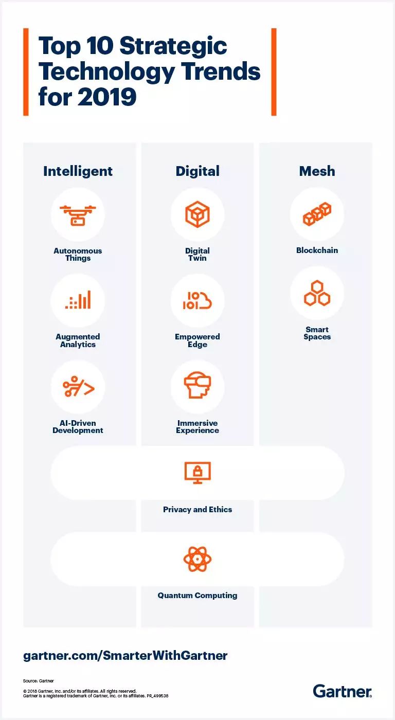 自主设备、增强分析、AI驱动的开发、数字双生、边缘计算、沉浸式体验、区块链、智能空间、数字道德和隐私、量子计算。这十大科技趋势被认为在未来5年将产生破坏性创新,并带来商业机遇。Gartner副总裁David Cearley认为,无处不在的智能设备提供各种基于大数据的贴心服务,将是科技的未来。Gartner称之为Intelligent Digital Mesh。