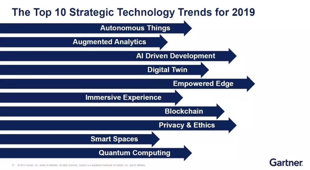 近日,全球最具权威的IT研究与顾问咨询公司Gartner发布了《Gartner 2019 年十大战略性技术趋势》报告 (GartnerTop 10 Strategic Technology Trends2019)。Gartner公司列出了企业组织在2019年需要探究的十大战略性技术趋势:自主设备、增强分析、AI驱动的开发、数字双生、边缘计算等。