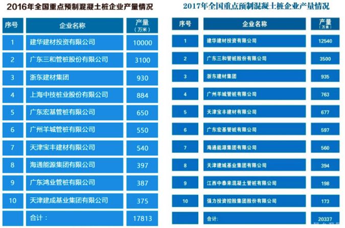 据中国混凝土与水泥制品协会发布的2016、2017两年预制混凝土桩产量排名显示,建华建材预应力混凝土桩的产量遥遥领先: