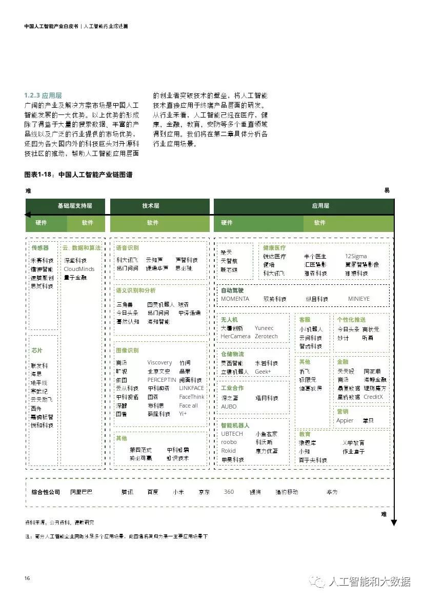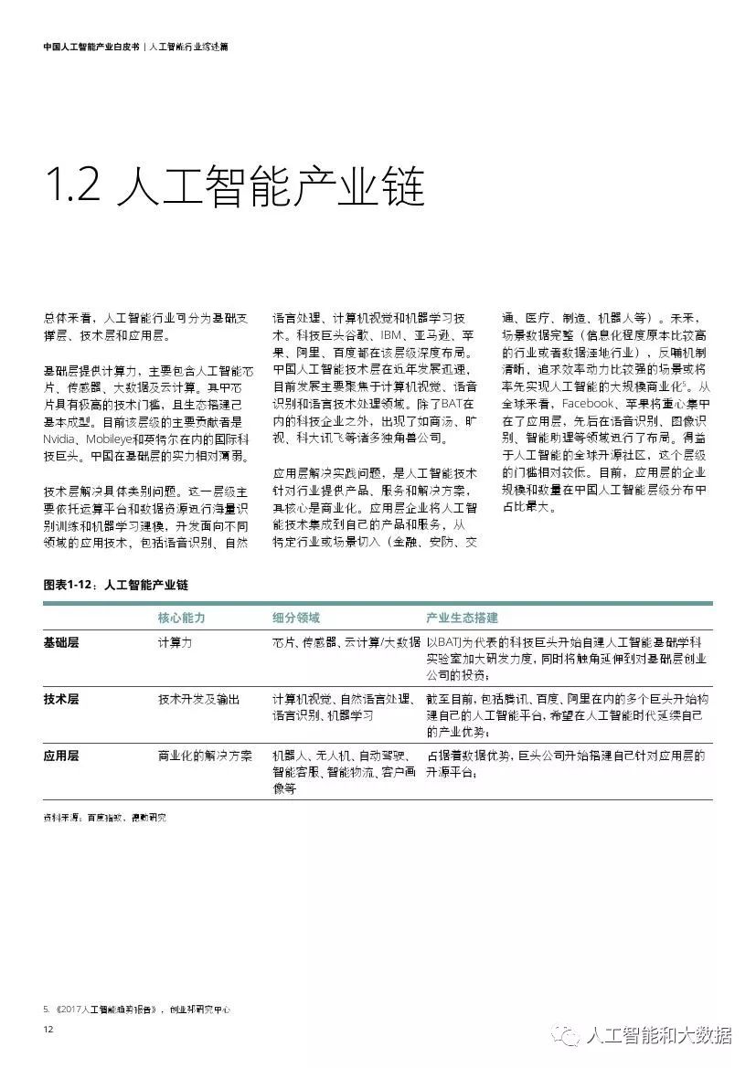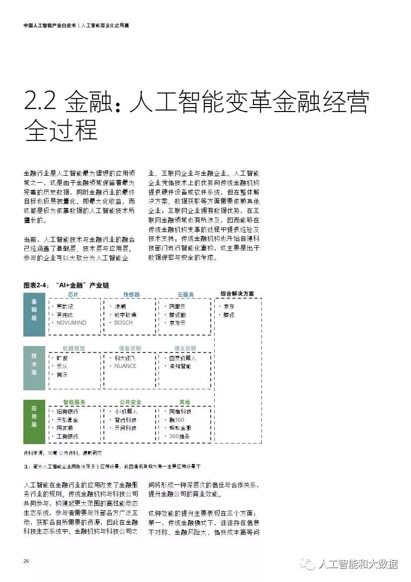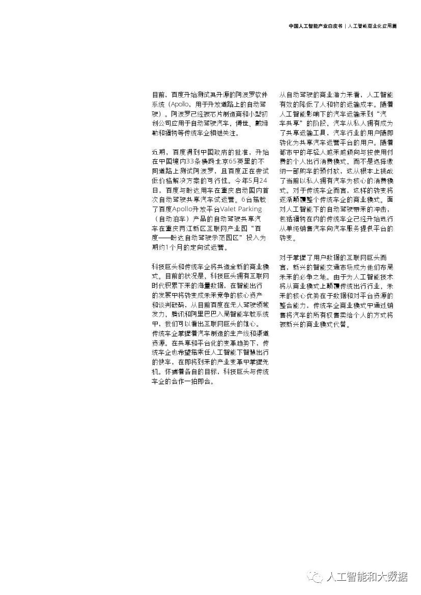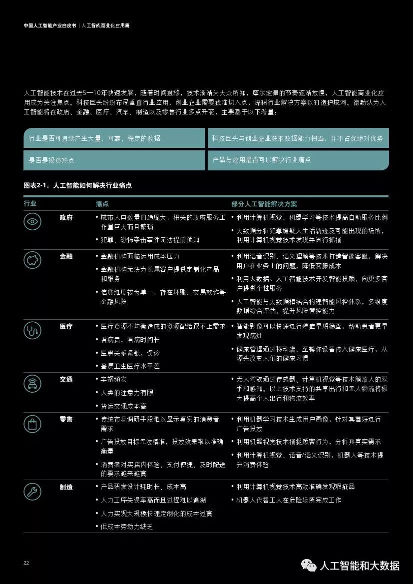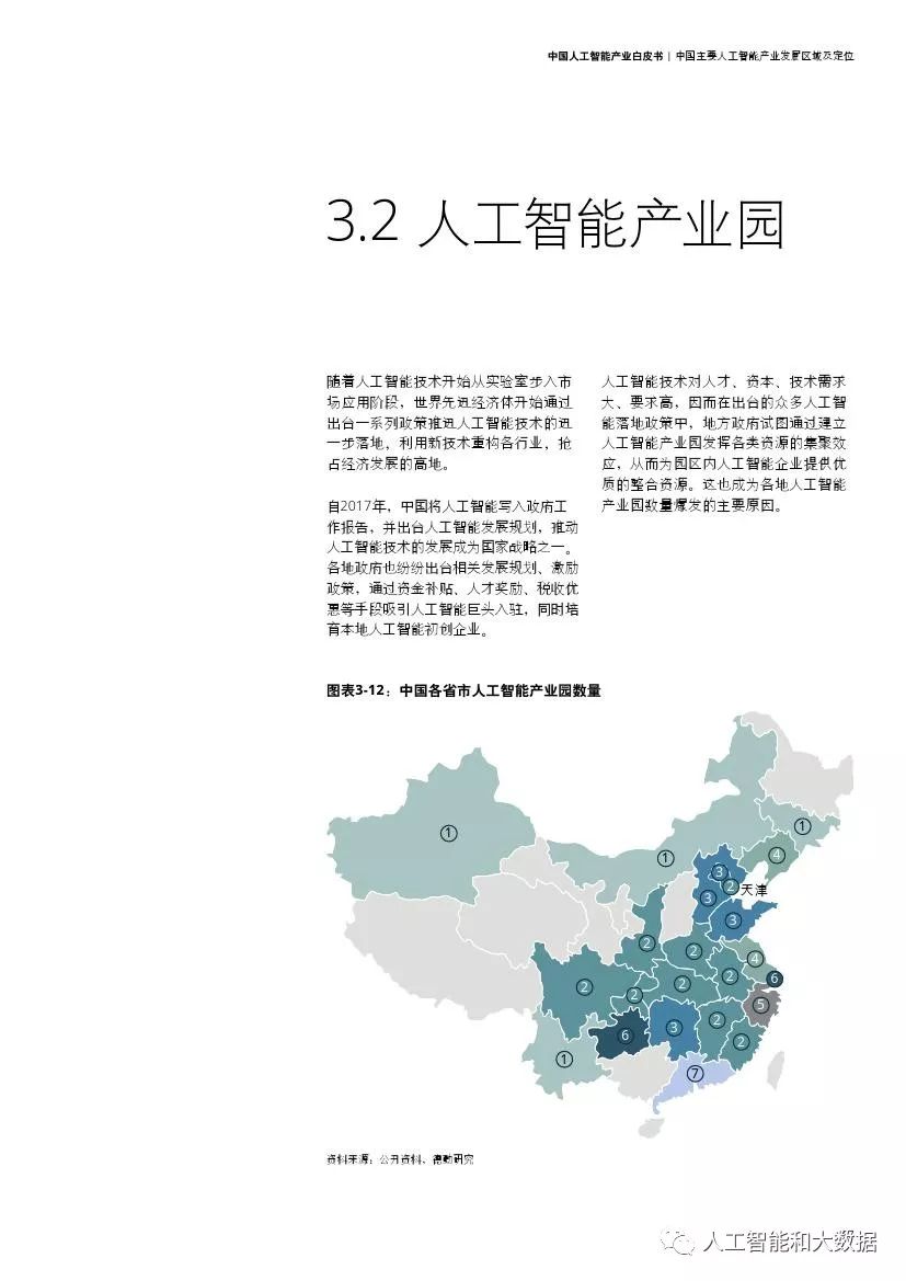 《中国人工智能产业白皮书》从人工智能行业综述、商业化应用、中国主要人工智能产业发展区域及定位三大章节对中国人工智能产业进行了分析。重点内容摘录如下: