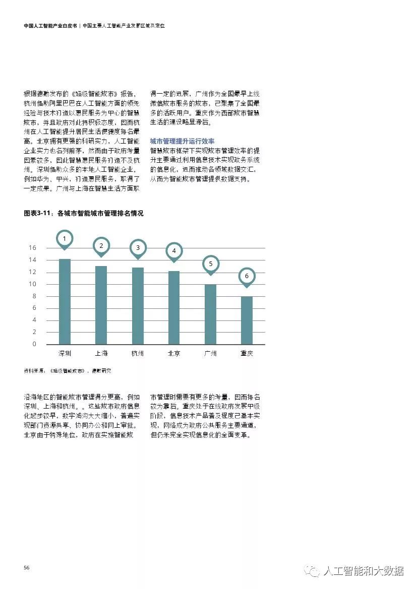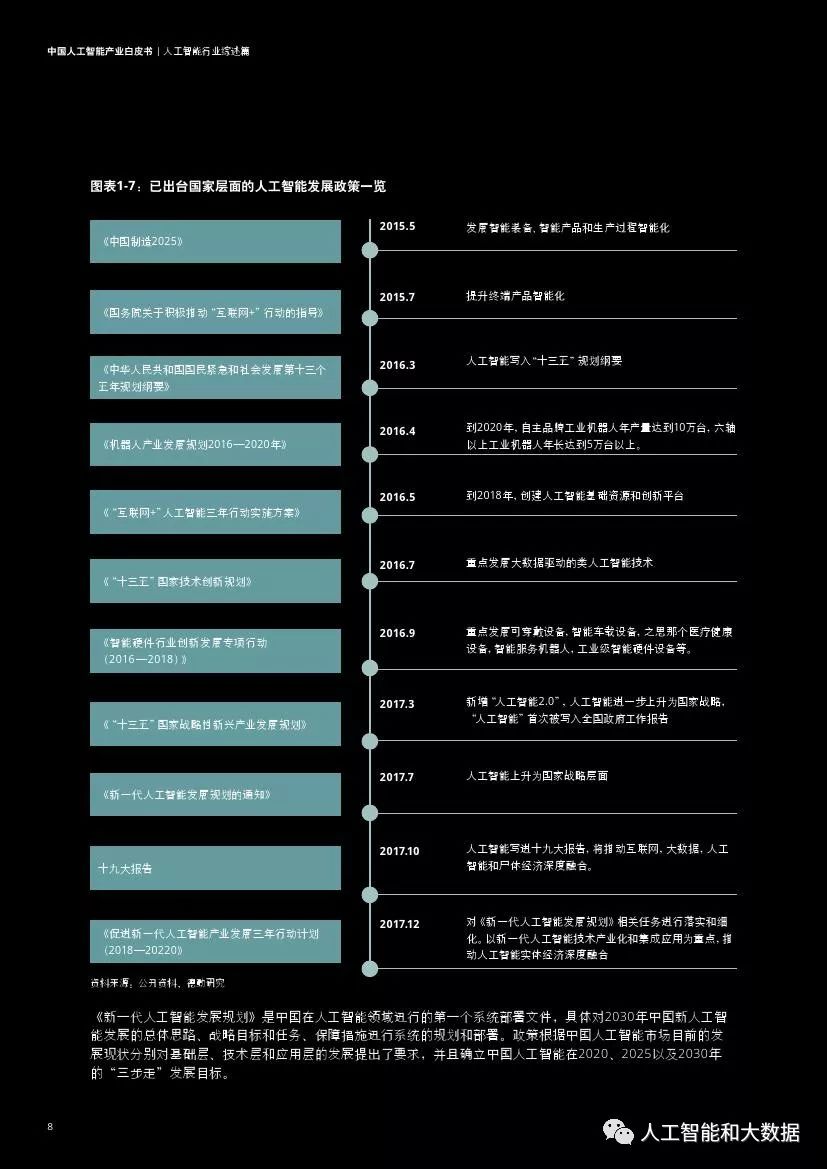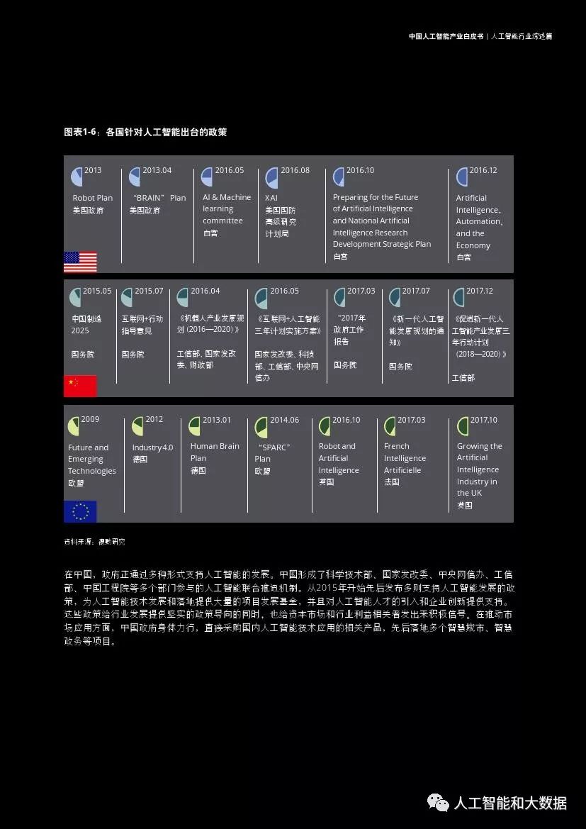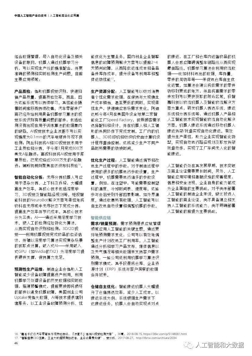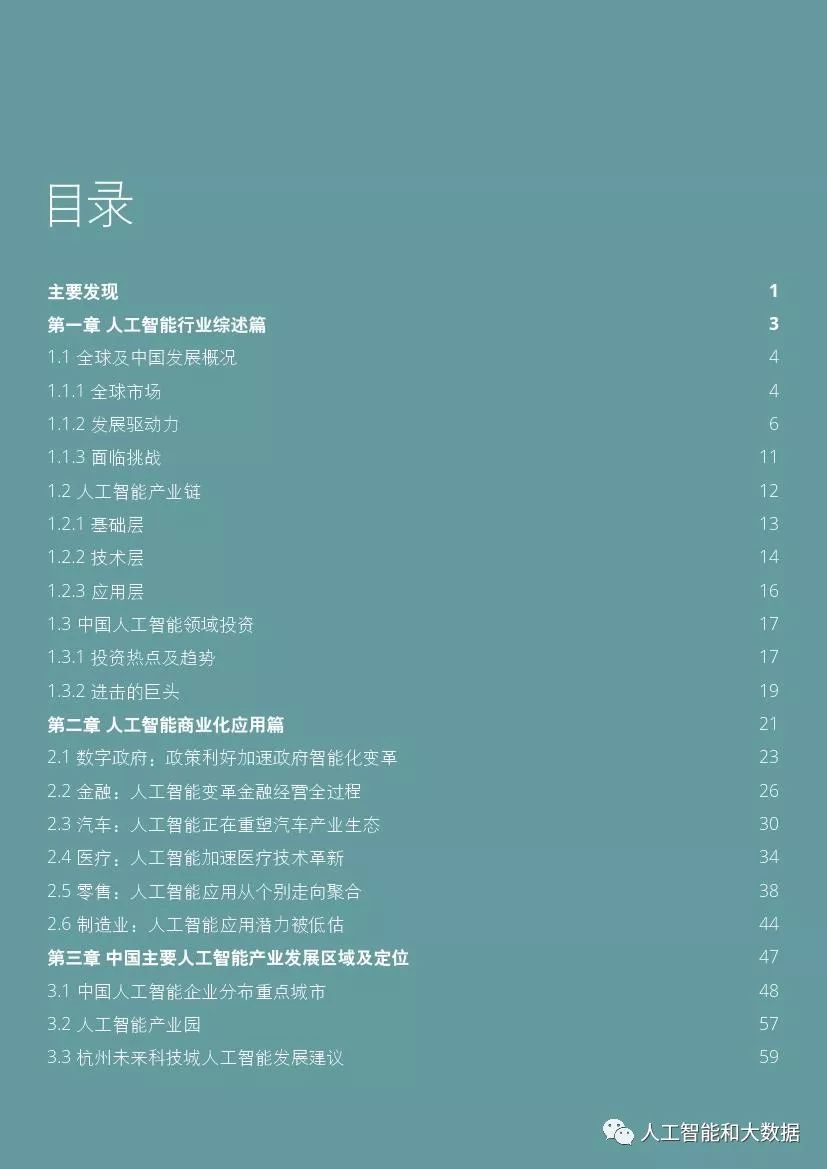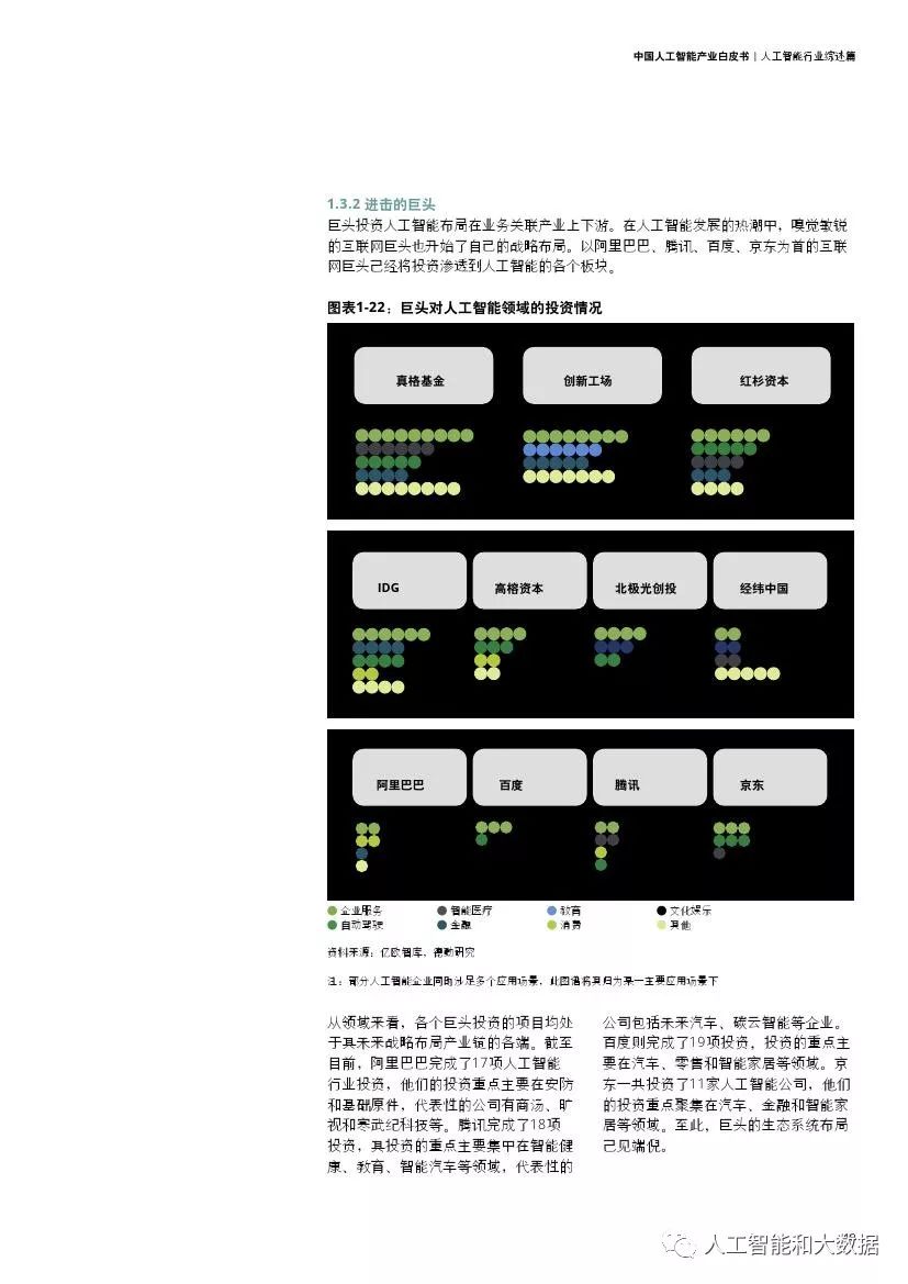 《中国人工智能产业白皮书》从人工智能行业综述、商业化应用、中国主要人工智能产业发展区域及定位三大章节对中国人工智能产业进行了分析。重点内容摘录如下: