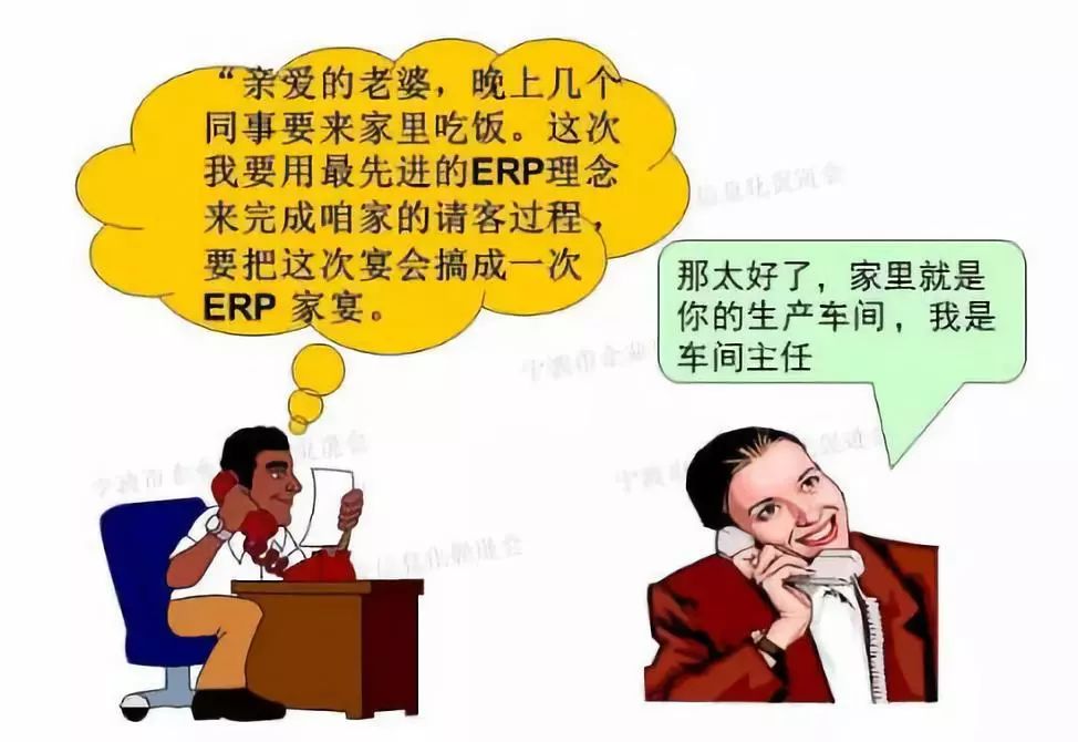 一天中午,老张突然回到家里对妻子说:“亲爱的老婆,晚上几个同事要来家里吃饭。这次我要用最先进的ERP理念来完成咱家的请客过程 ,要把这次宴会搞成一次ERP家宴。你看,我已经用CRM 客户关系管理模块全面管理与这几个同事的关系往来 。这次他们确定要来吃饭的相关信息,我已经放到销售管理中的合同管理和订单管理中,而且已经自动传递相关数据到应收帐模块、财务模块、还有主生产计划模块中,根据客人的意向和要求,确定最后做什么菜,也就是主生产计划都有了”