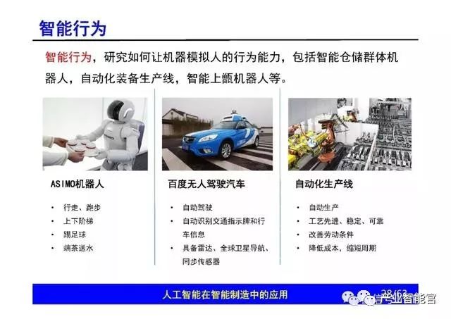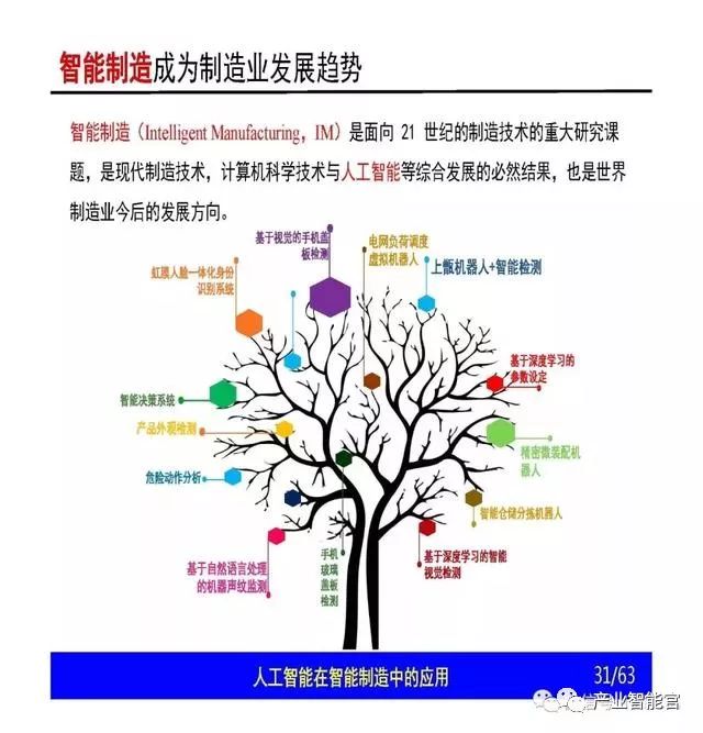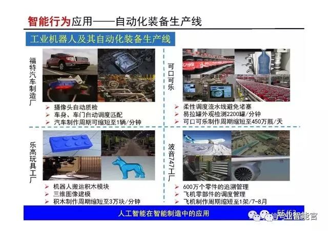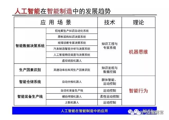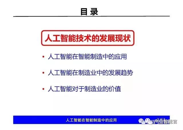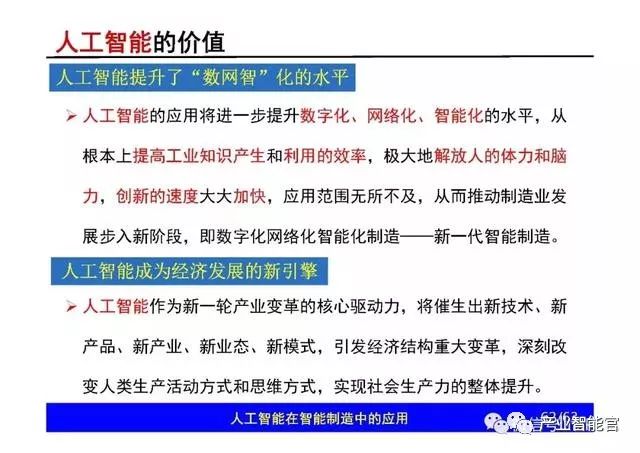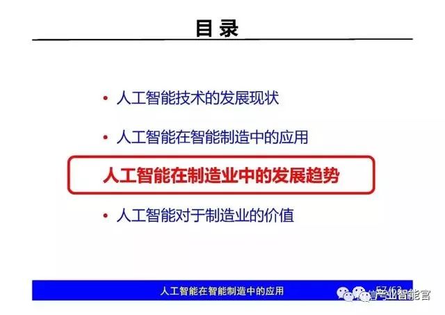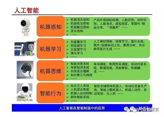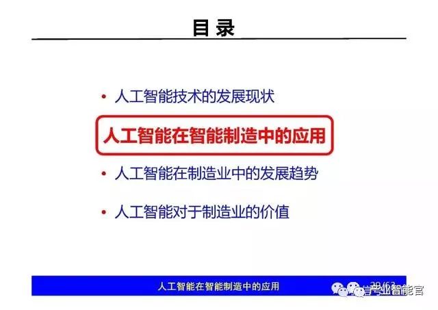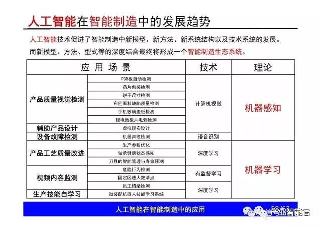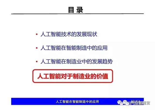 摘 要:报告主要讲述了人工智能技术在制造业中的发展现状,人工智能在制造业中的应用模式及其发展趋势,在智能制造中的应用案例,最后阐述了人工智能对于制造业的价值。