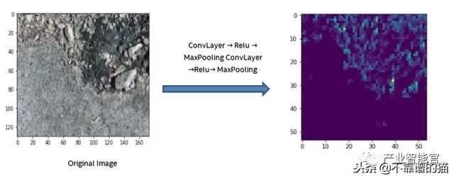 将两个Conv(一个3X3 filter),ReLU和Max Pooling(2X2)类似于LENET-5架构的层应用于上面的裂缝图像。从下面可以看出,CNN架构专注于裂缝区域的块及其在整个表面的扩散: