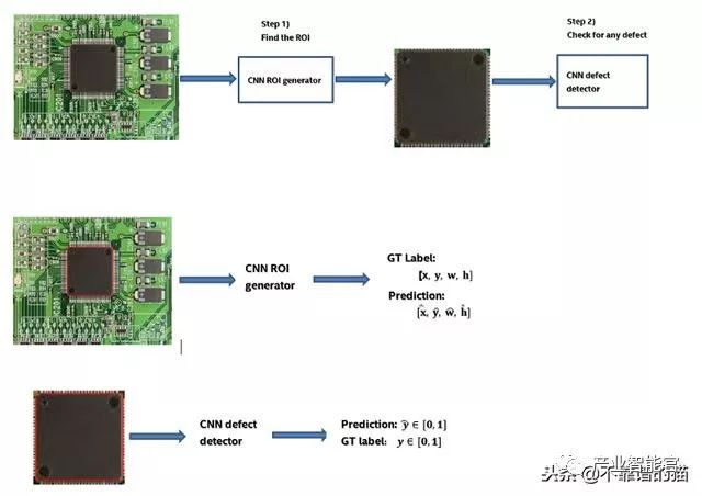 解决方案:我们构建了一个端到端的two step DL架构。在第一步中,我们使用DL方法来预测ROI本身,而不是CV方法。我们使用边界框工具手动创建了带标签的数据集,我们训练DL架构来预测ROI。这种技术的一个缺点是标记的数据集必须明确且足够广泛,以包括所有产品类型等(在我们的抽象示例的情况下的电路板类型/芯片类型),以便深度神经网络很好地概括看不见的图像。请参考下图:
