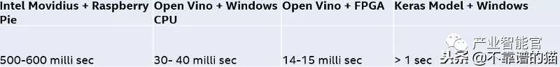 很明显,使用软件堆栈进行优化对于缩短推理时间至关重要。使用OpenVino软件优化,我们看到延迟时间缩短了30到100倍。此外,除英特尔CPU外,我们还推出了其他英特尔硬件加速器,如英特尔Movidius和FPGA。以下是样本图像的一些推理基准: