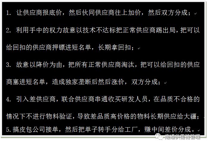这里的“采购腐败”不仅仅局限于采购部门的腐败,还包括发生在非采购部门的采购腐败。正如大疆反腐公告里提到的“供应商引入决策链条中的研发人员、采购人员、品控人员”,以及“其他体系中的行政人员、售后人员等”。这就是本文题目之所以叫“采购侧供应链腐败”而不是“采购腐败”的原因。采购侧供应链是指从供应商到内部使用部门的一系列供需环节构成的链条(敬请参阅《从企业运作角度思考采购的职能》)。大疆公告中提到的供应链腐败应该就是指采购侧供应链的腐败。