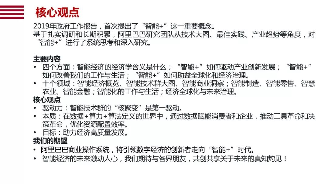 针对2019年两会“智能+”重要战略,阿里巴巴近日发布了《从连接到赋能:“智能+”助力中国经济高质量发展》报告,该报告尝试回答以下几个问题: