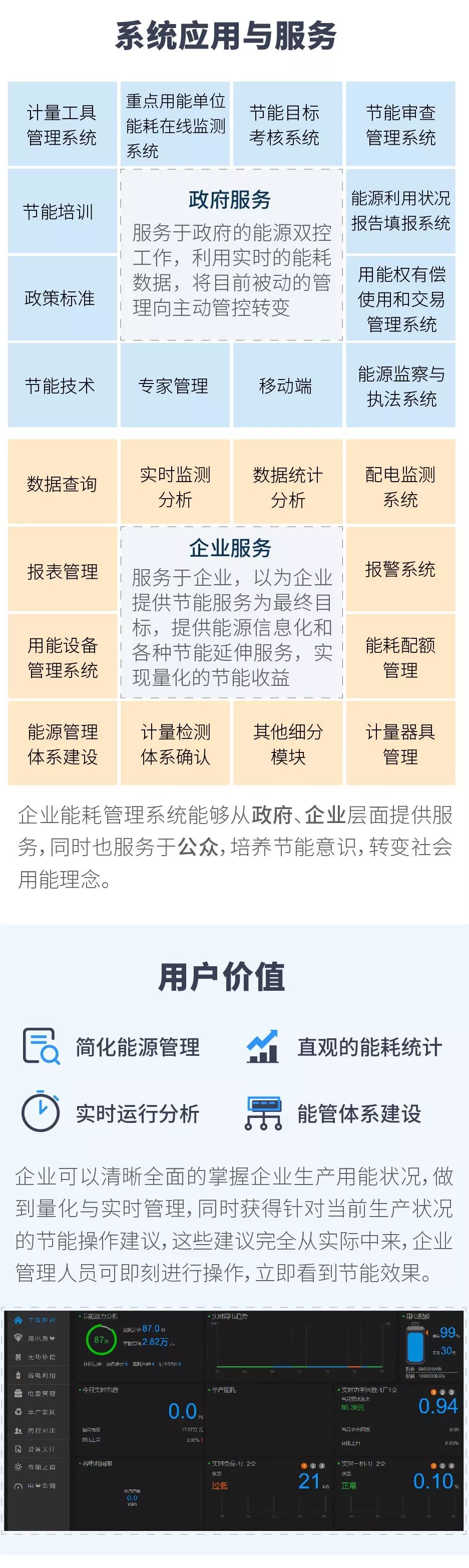 紫光云引擎联合合作伙伴共同打造企业能耗管理系统,服务于工业企业和政府部门,通过先进技术和管理手段,实现能源消耗的实时监测及能耗数据统计分析,并提出反馈建议,最终提升能源利用效率和利用水平、降低能源漏损率。