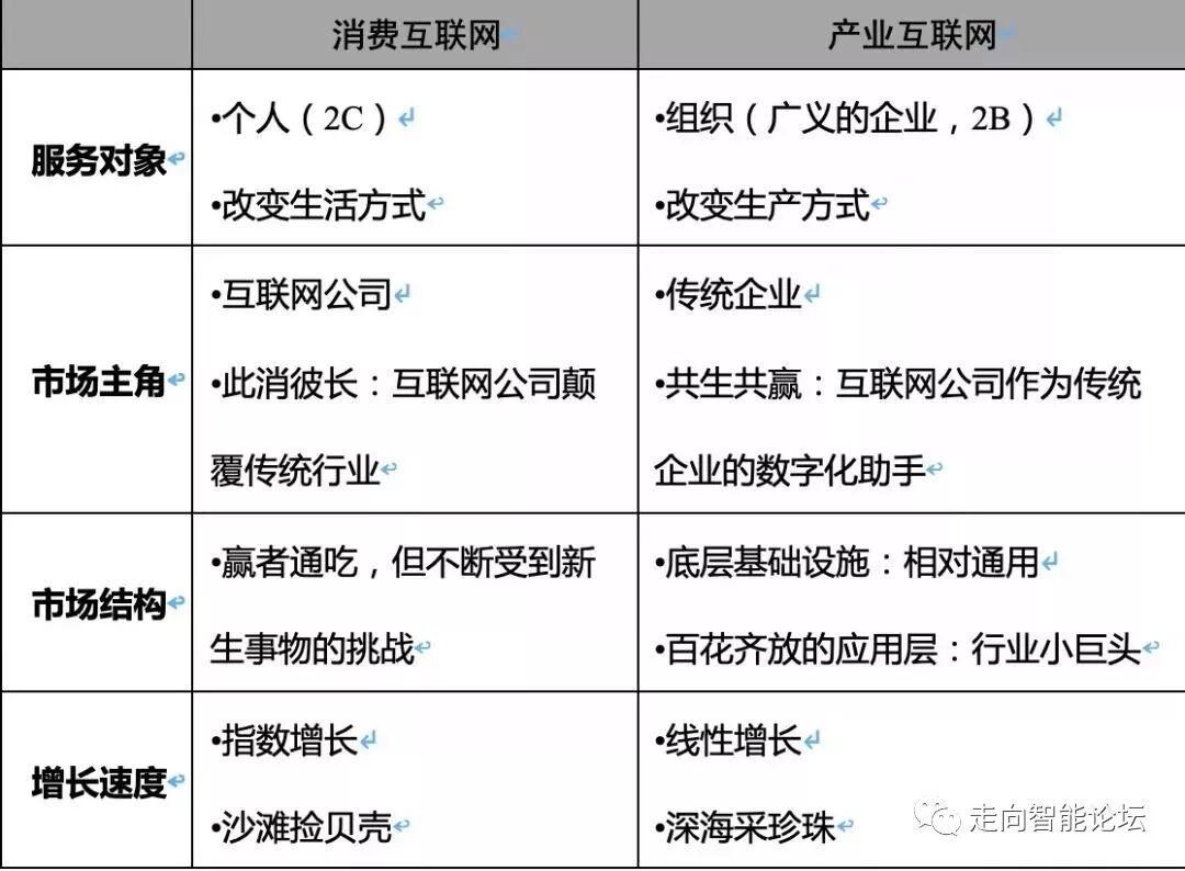 消费互联网和产业互联网的区别主要体现在服务对象、市场主角、市场结构和增长速度四个方面。如下表所示。