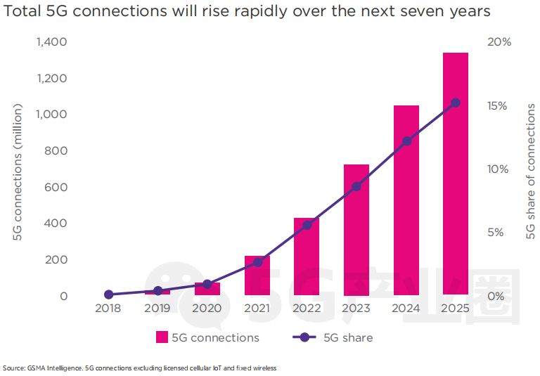 GSMA Intelligence预计5G将会在2020年代普及。2025年之前,全球将会有14亿连接,2021年5G连接只有大约2亿。这也就是意味着,2025年时5G将会占到全球所有移动连接的15%还要多。