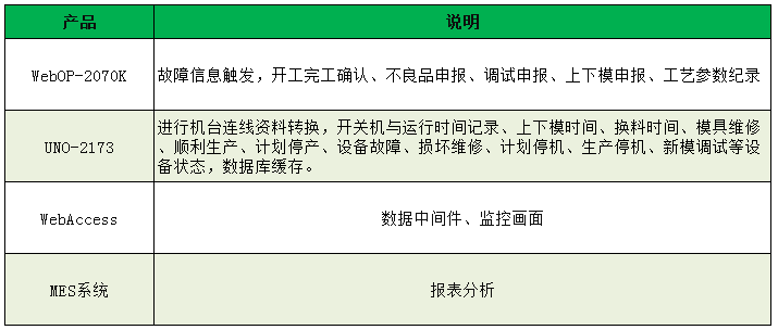 网关:进行机台连线资料转换,开关机与运行时间记录、上下模时间、换料时间、模具维修、顺利生产、计划停产、设备故障、损坏维修、计划停机、生产停机、新模调试等设备状态,数据库缓存。