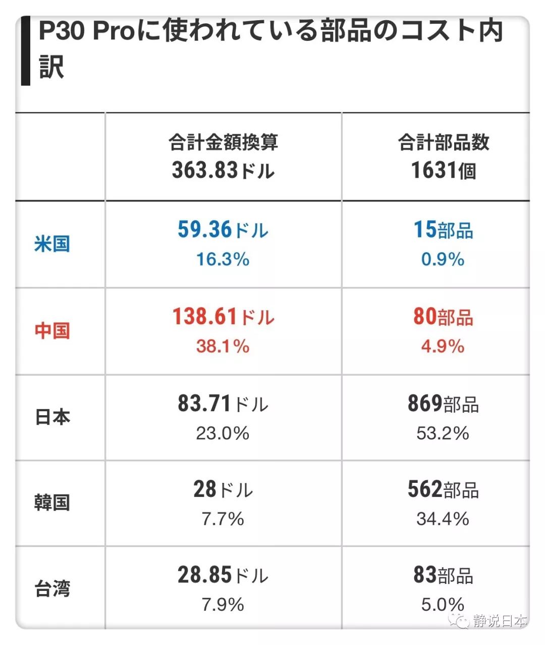 那么,一台华为手机,它用了多少日本的零部件?6月27日,日本经济新闻发表了一篇文章,对最新的华为手机进行了解剖,发现美国产的零部件只占0.9%,估计是以高通的芯片为主。中国自己制造的零部件,只占到4.9%。那么,日本制造的零部件有多少呢?有869个,占到整台华为手机零部件总量的53.2%。