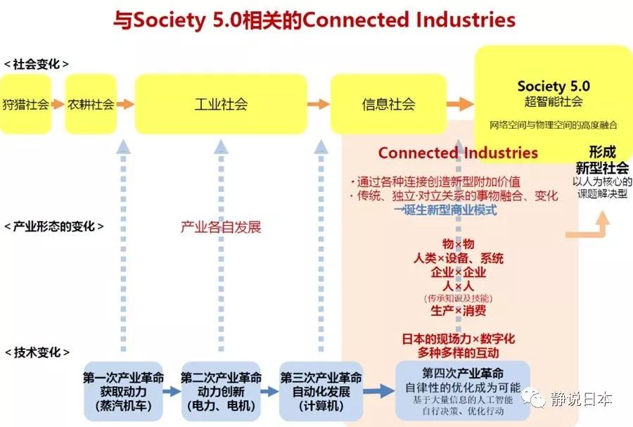 日本正在朝着超智能社会——也就是“社会5.0”方向发展,以解决一些迫切性很强的社会问题,包括老龄化、人手不足、社会环境能源制约等。日本政府每年制定政策的时候,未来的投资计划和战略都包含“社会5.0”的内容,包括综合的解决方案和创新。社会5.0是现在的信息化社会的下一步方向。而要实现社会5.0,产业所面临的最重要的方向,就把定位于互相连接的制造,也就是“互联工业”。