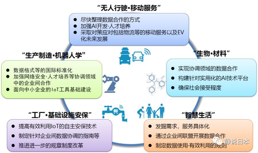为了推进“互联工业”,日本经济产业省确定了今后努力的产业方向。日本今后将在5个重点领域寻求发展:
