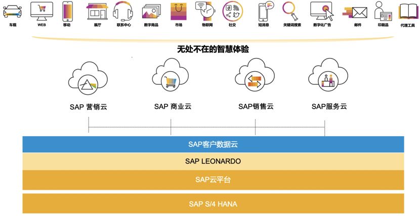 在客户数据云之上,是SAP的营销云、商业云、销售云和服务云,具体实现汽车领域的市场、电商、销售和售后服务的功能,并将功能扩展到不同类型的渠道,如Web、移动、社交等等,实现“无处不在的智慧体验”。