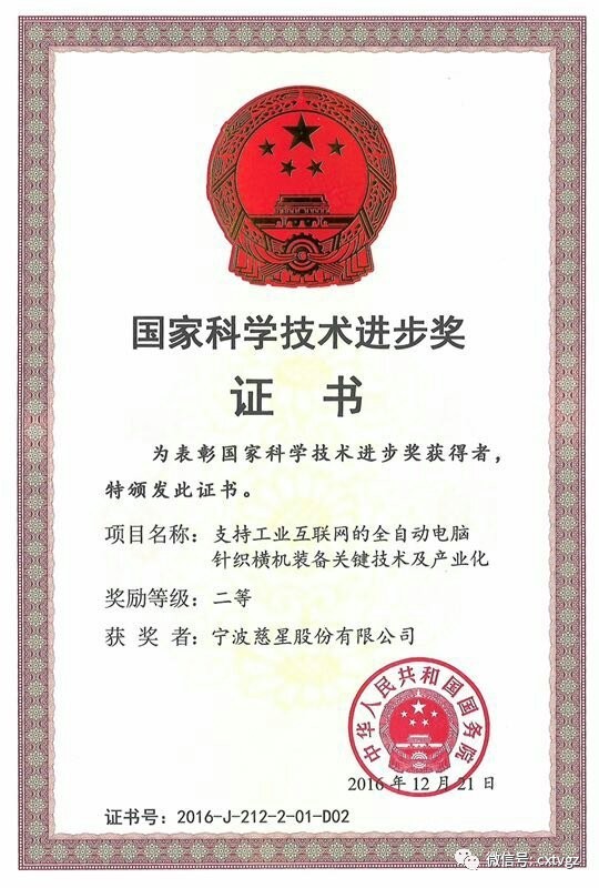 2016年度国家科学技术奖励大会在北京人民大会堂召开。宁波慈星股份有限公司科研团队主导完成的“支持工业互联网的全自动电脑针织横机装备关键技术及产业化”,获得国家科学技术进步二等奖。