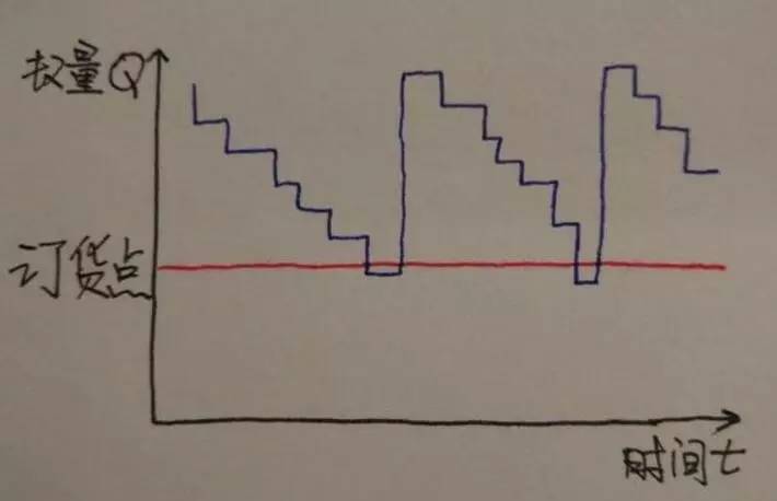 就是当库存量下降到红色那条线时,进行采购,补充库存,从订货开始到物料入库的时间称为提前期,订货点=单位时区需求量x提前期+安全库存,这种库存管理办法始于20世纪30年代,长时间观察下去,库存曲线如下: