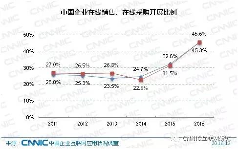 根据中国互联网络信息中心CNNIC最新发布的《第39次中国互联网络发展状况统计报告》数据,2016年中国企业在线销售、在线采购的开展比例分别达45.3%和45.6%,相比去年实现超过10个百分点的增长。