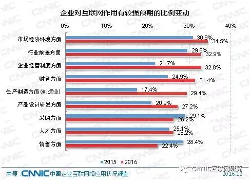 调查结果显示,当被问及互联网能否帮助解决各项经营管理问题时,越来越多的企业表示认可。与2015年相比,企业对互联网所能发挥的作用有较强预期的比例均出现提高,但对不同问题的排序有所变动:采购、销售、人才问题排序下降,经营制度、财务、生产制造的排序上升,反映出互联网在解决企业核心问题的能力正在提高。