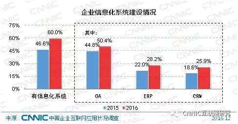 2016年,60%的企业建有信息化系统,相比2015年提高13.4个百分点。其中分别有50.4%、28.2%和25.9%的企业建有办公自动化(OA)系统、企业资源计划(ERP)系统和客户关系管理(CRM)系统。在供应链升级改造过程中,尤其是在涉及经营管理的核心流程中,企业日益重视并充分发挥互联网的作用。