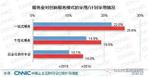 得益于政府鼓励,创新技术的研发与应用实践获得政策支持。全社会创新氛围已经形成,正在深刻影响着企业的转型升级路径。相比2015年,企业对云计算、大数据、物联网等新技术的采用/计划采用比例提升明显,均已接近或超过20%。其中服务业企业已开展或计划开展相应创新服务模式的比例分别为25.6%、19.0%和14.0%,相比去年上升明显。