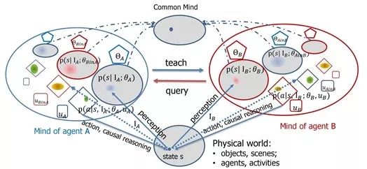 这个图里面是两个人A与B的交流,一个是老师,一个是学生,完全是对等的结构,体现了教与学是一个平等的互动过程。每个椭圆代表一个脑袋mind,它包含了三大块:知识theta、决策函数pi、价值函数mu。最底下的那个椭圆代表物理世界,也就是“上帝”脑袋里面知道的东西。上面中间的那个椭圆代表双方达成的共识。