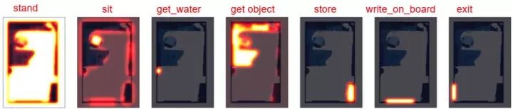 当机器人重建了三维场景后(在谈视觉的时候提到了,这其实是一个与任务、功能推理的迭代生成的过程),它就带着功利和任务的眼光来看这个场景。如下图所示,哪个地方可以站,哪个地方可以坐,哪个地方可以倒水等等。下面图中亮的地方表示可以执行某个动作。这些图在机器人规划中又叫做AffordanceMap。意思是:这个场景可以给你提供什么?
