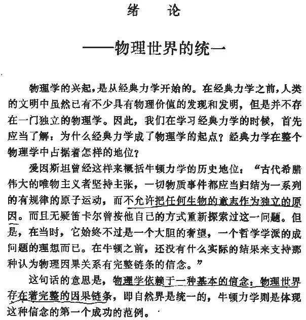 等到开学,上《力学概论》的课,教材是当时常务副校长夫妇写的,我这里就不提名字了,大家都知道,这是科大那一代人心中永恒的记忆。翻开书的第一页,我就被绪论的文字震撼了。下面是一个截图,划了重点两句话,讨论如下。