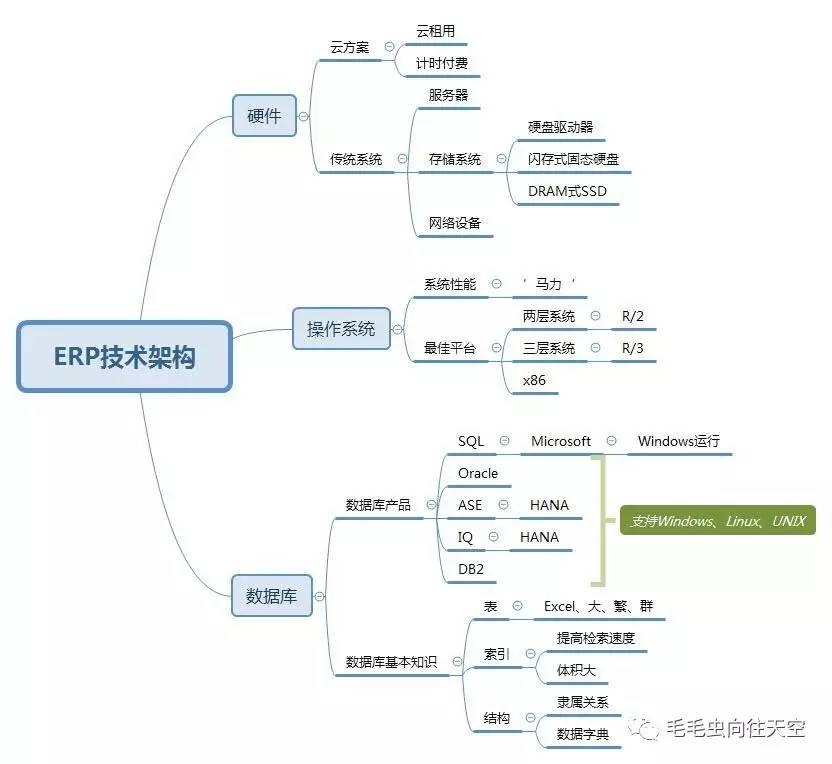 数据库,属于ERP应用程序的下层支持,比较常用的数据库当然是SQL和Oracle了,当然还有IBM的DB2,Sybase后来被SAP收购了,推出ASE和IQ数据库;