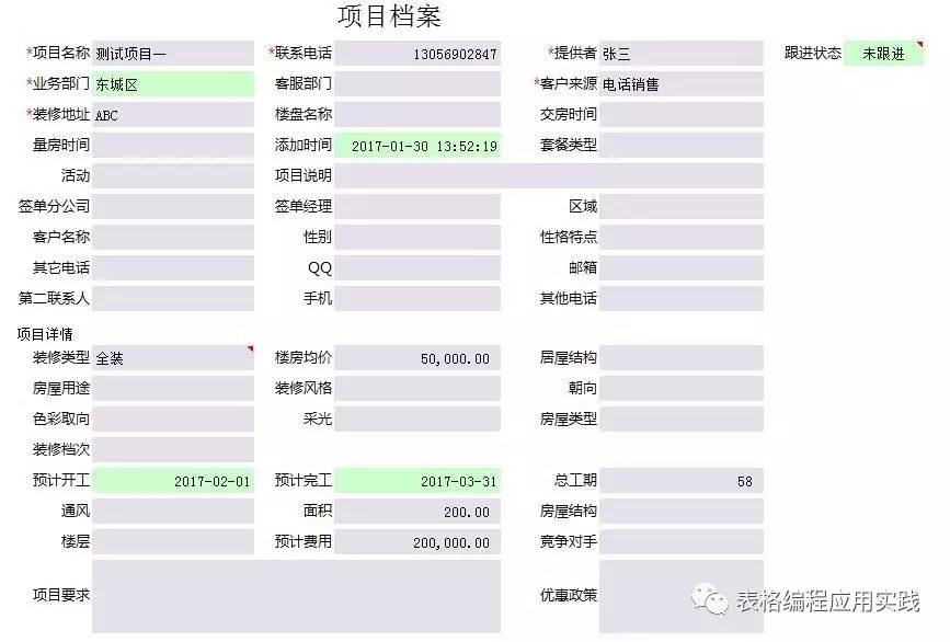 001项目档案模板,记录项目基本信息和作为三表设计法的档案表之用,如下图: