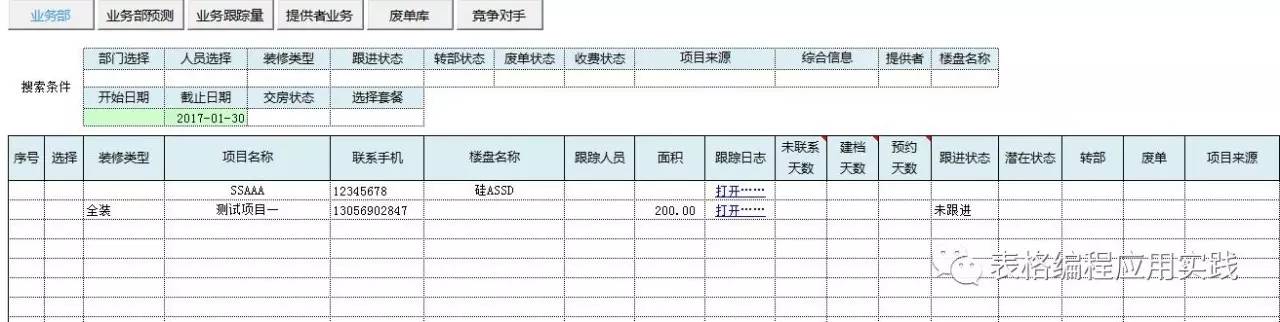 在建立了项目档案之后,就可以设计一个002业务管理表,从业务部门开始,通过业务管理表对项目进行全方位管理,如下图: