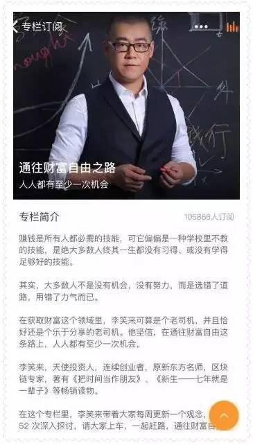 李笑来曾是新东方老师,也是一名投资人。罗辑思维创始人罗振宇邀请其在“得到”APP中写专栏。截至12月27日下午4点,李笑来在得到App上的专栏《通往财富自由之路》共有105866人订阅,换算成营收的话,需要把人数乘以单价199元,得出的结果是21067334人民币元——这就是李笑来在不到5个月时间里的成绩,一个专栏,卖了2000多万元。