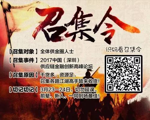 2017年已经来临,产业互联网、B2B电商、区块链、大数据、物联网、金融科技等各个领域都往供应链金融领域渗透,可谓是千帆竞发,百舸争流,2017年3月23日,第四届中国供应链金融创新高峰论坛即将在创新之城深圳举行,40+业界翘楚,500+政产学研媒行业精英齐聚鹏城,先睹为快,猛击“阅读原文”,或致电:邓老师 13875939368;张老师 13920373929;肖老师 18319602831。