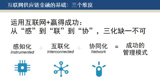 从“感”到“联”到“协”,感就是感知化,就是我们能不能做到整个产业生态的信息数据化?这一点是非常重要。如果做不到这个,我们要想走向互联网供应链金融相对比较难。第二个就是“联”,“联”意味着主体生态化,我们能不能形成一个生态大家共生、互生、再生的一种场景?第三个就是协同化,意味着流程、要素的集成化。