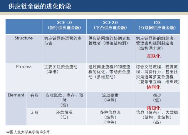 从风险管理的要素上,原来我们控制的应收、库存和预付,比如说应收类的保理,像库存类的静态抵制押,动态抵制押,包括我们说的像保兑这样的预付。但是到第二个阶段的时候,关注的是交易结构以及结构中的信息。到了互联网供应链金融的时候,更多关注的就是无形的东西。比如说大数据,比如说我们物联网所产生的信息,我们所有的这些东西,成为我们今天风险控制的核心所在。三个不同阶段的供应链金融表现特征不一样。