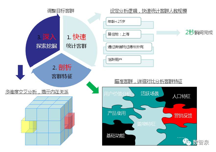 作为营销人员,首先你需要确认营销目标群体,并且在什么时间以什么形式,开展什么营销活动效果最好?你首先需要找到目标群体号码包,通过指定条件(如性别、年龄、兴趣爱好,曾经有过类似行为)提取号码包;通过大数据分析,得知在某个时间段参与人数较多,哪种类型的活动效果更受欢迎,目标用户群体有哪些共同特征。掌握这些,你的营销活动效果更加好;