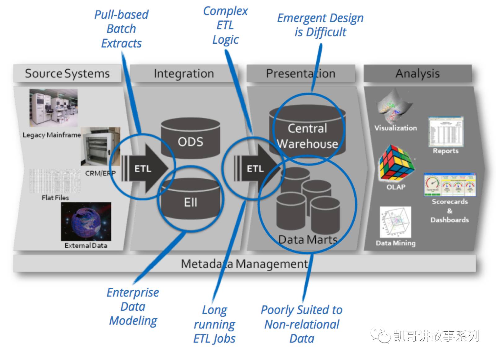 来自精益数据专家Ken Coller的总结,很清晰的说明了传统数据仓库的局限性: