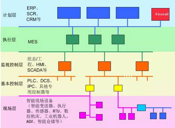 智能工厂/数字化车间互联网络各层次定义的功能以及各种系统、设备在不同层次上的分配如下。