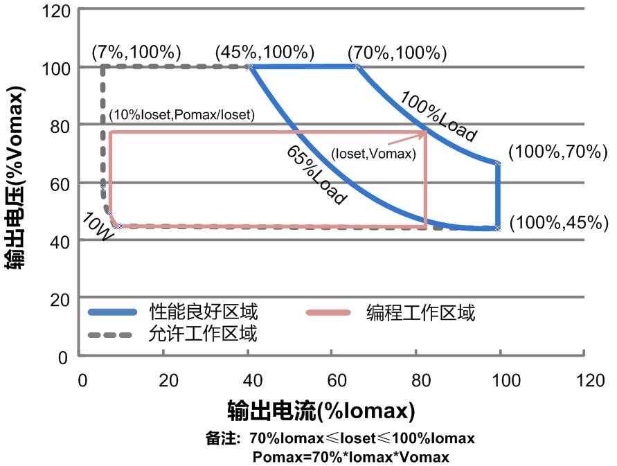 其主要特征为:输出宽电流/电压范围可调,并且在高效工作区域都能保证PF大于0.9,THD小于20%。图示蓝色框内即为恒功率可调产品的高效工作区域。