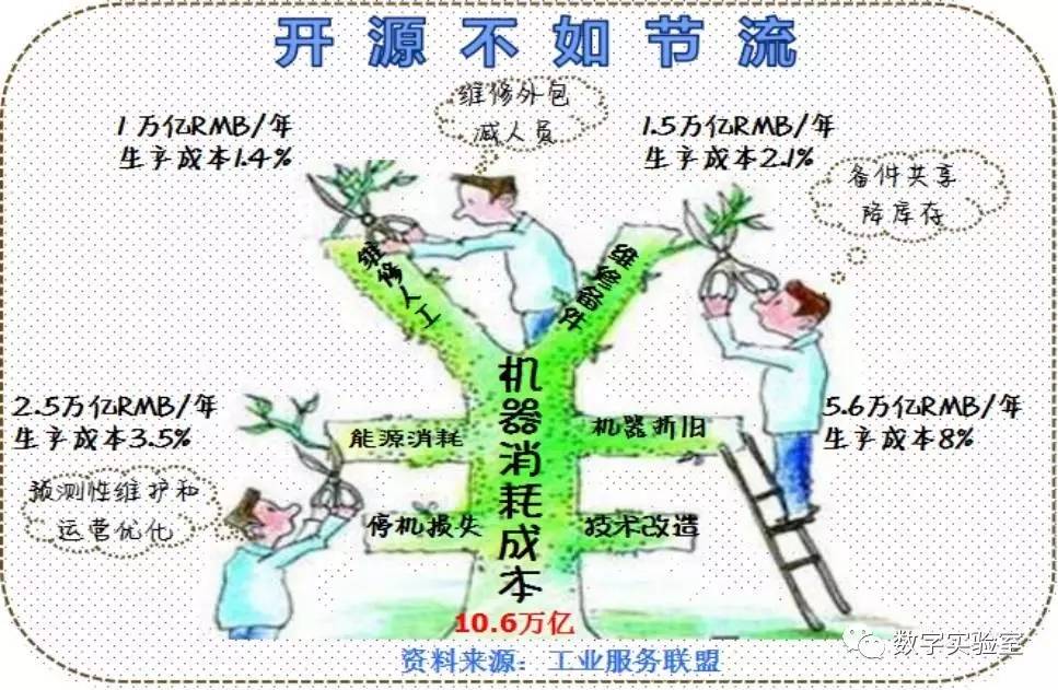 经济增长减速时代,开源不如节流,工厂成本主要发生在“人、机器、原材料”上。料的成本靠管理,比如供应链管理和丰田零库存管理;人的成本靠技术,比如机器人替代和人工智能替代;机的成本靠互联网连接,比如预测性维护和共享经济。用在“机器”这块的成本占生产经营成本的15%,放到全国来说就是10万亿,这一块成本以前没有受重视。