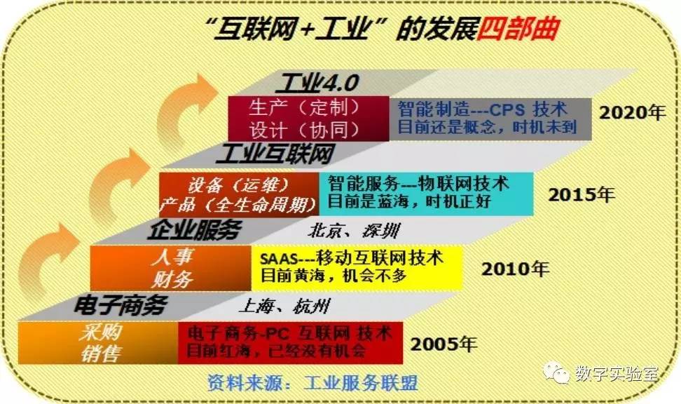 工业互联网在国际上是美国重返制造的机会,在国内也是一些地区实现飞跃的机会。在互联网与工业融合的过程中有四波机会,第一波是B2B 电子商务基本上属于杭州与上海;第二波是企业服务基本上属于深圳和北京。